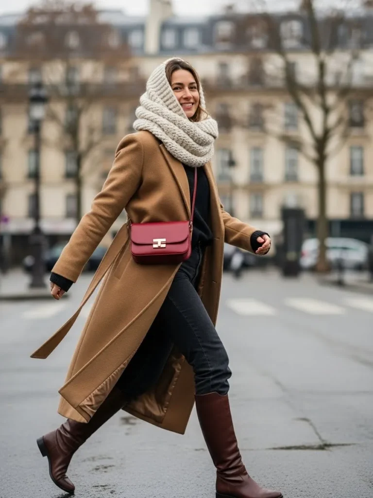 Here we have a warm camel coat layered over dark basics, styled with a chunky knit scarf and tall brown boots that feel both practical and elegant.