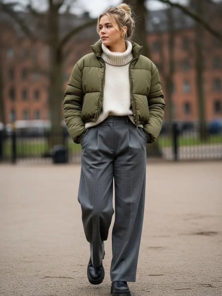 This look combines a cropped olive puffer jacket with a cream turtleneck, gray tailored trousers, and chunky black boots.