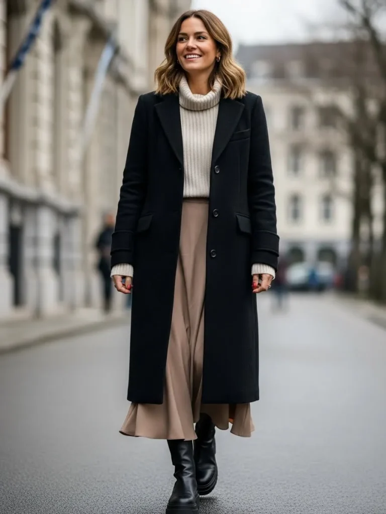 This outfit features a long black tailored coat layered over a chunky cream turtleneck and a soft beige midi skirt that moves beautifully while walking.