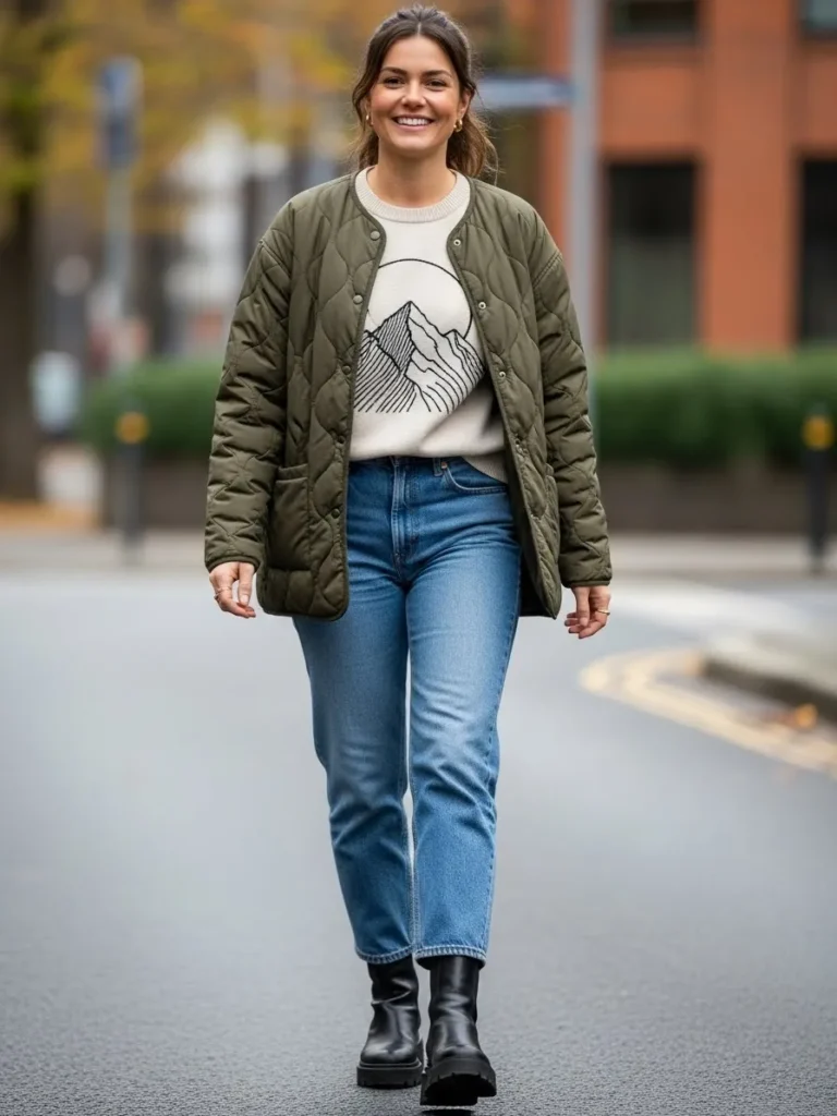 This outfit combines a quilted olive jacket with a casual graphic sweater, classic blue jeans, and chunky black boots.