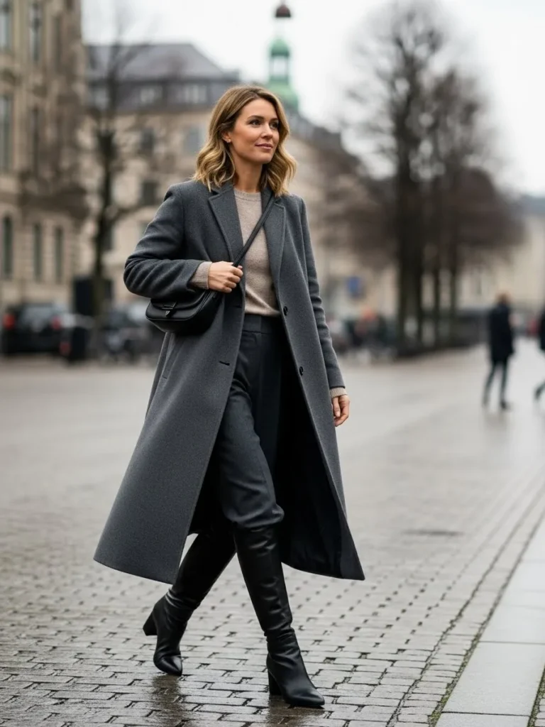 This look features a tailored gray coat layered over a neutral sweater and dark trousers, finished with sleek tall black boots.