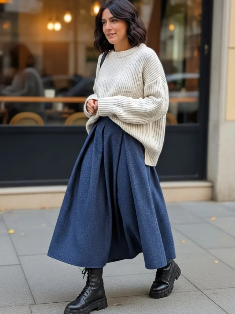 This outfit pairs an oversized cream sweater with a flowy blue midi skirt and chunky black lace up boots.