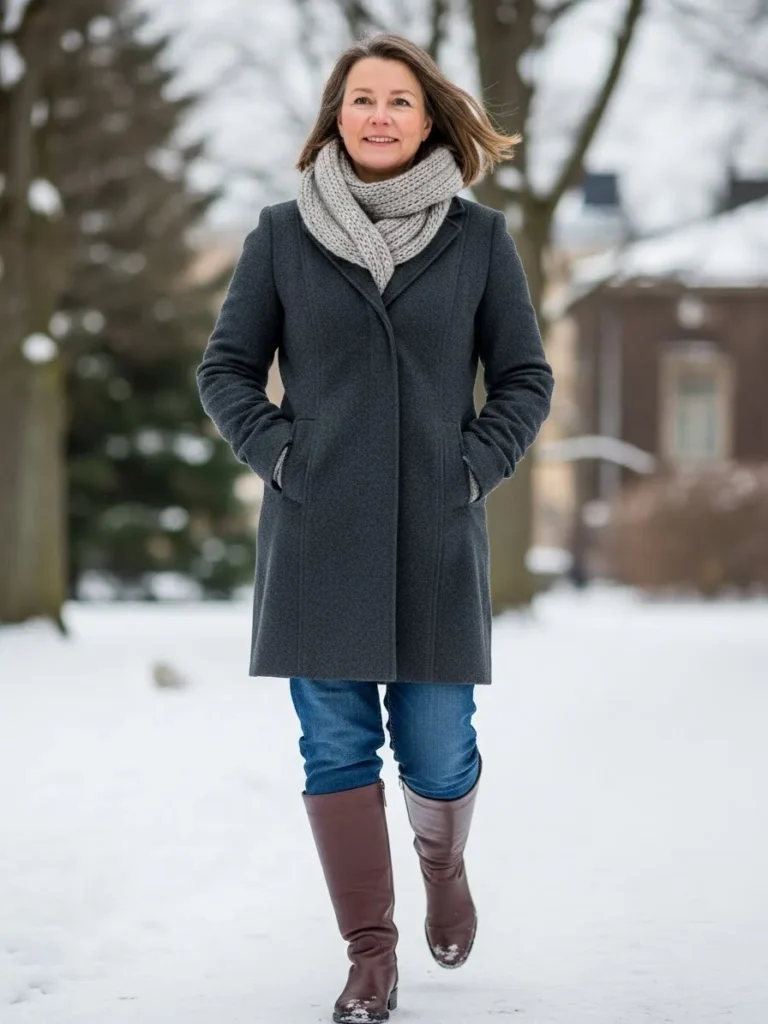 This outfit features a dark wool coat layered over a cozy scarf, blue jeans, and classic tall brown boots.