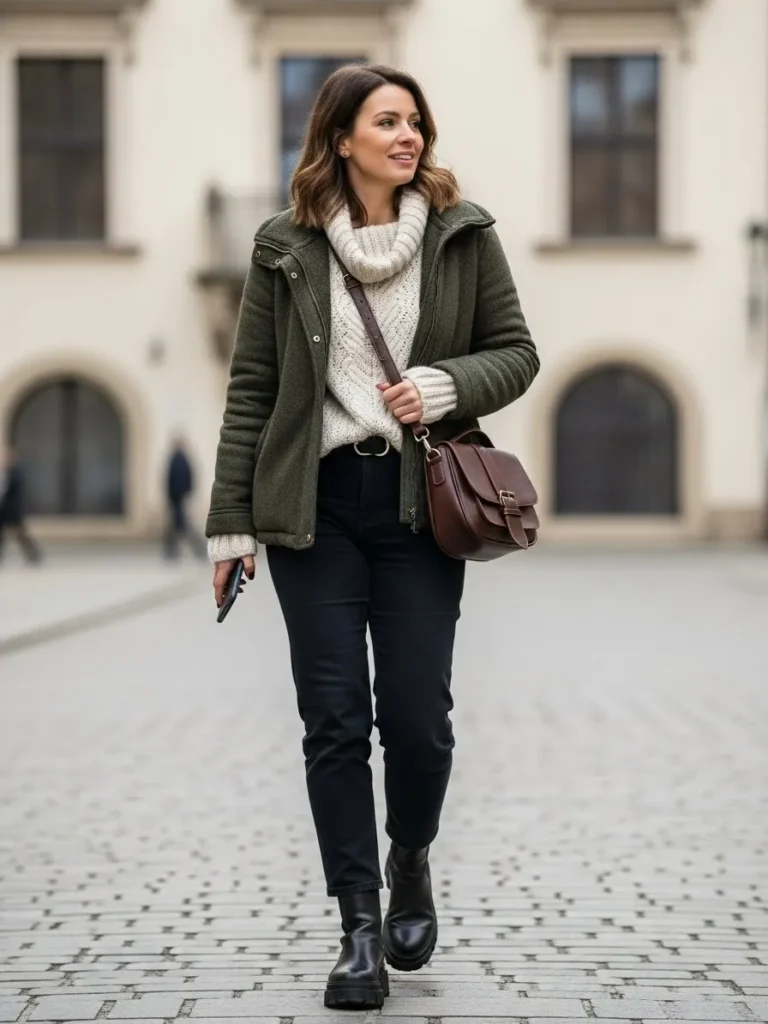 This outfit pairs a cozy olive green jacket with a chunky cream knit sweater, fitted black jeans, and sturdy black boots with thick soles.