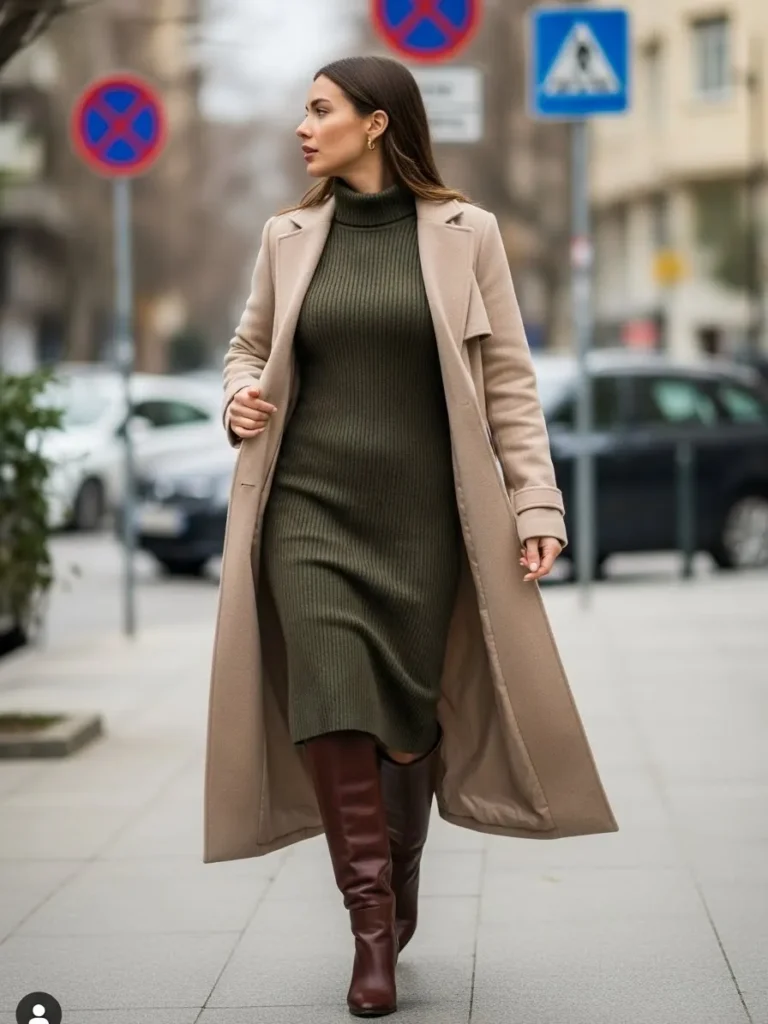 This look features a ribbed olive knit dress layered under a long beige coat, finished with rich brown knee high boots.