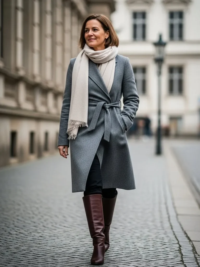 This outfit pairs a tailored gray wrap coat with a soft neutral scarf and slim dark pants, finished with rich brown knee high leather boots.
