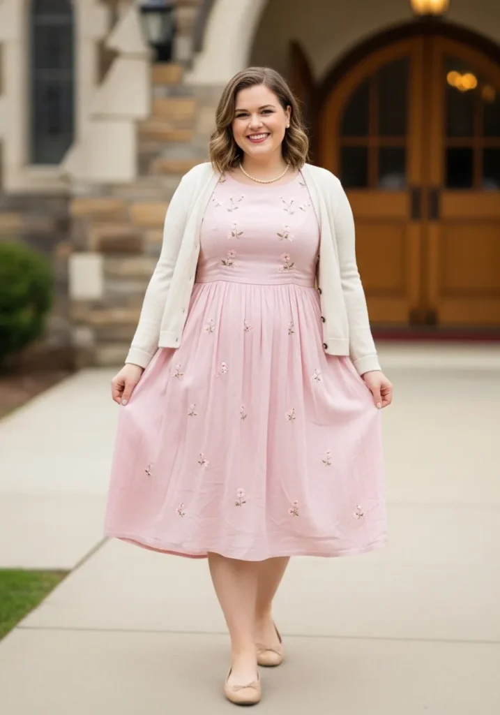 This outfit features a soft blush pink midi dress with a gently gathered skirt that falls just below the knees. The dress has delicate texture across the fabric which adds subtle detail without feeling busy. A light cream cardigan drapes softly over the shoulders and keeps the outfit modest and polished. Neutral ballet flats complete the look and the overall style feels graceful and relaxed in front of the church entrance.