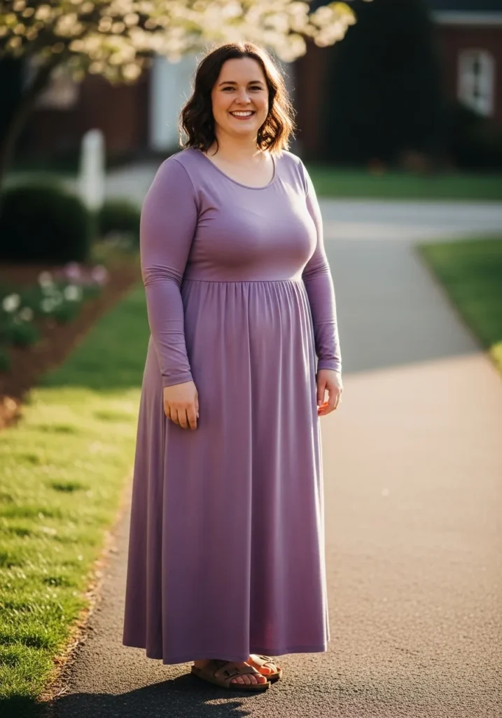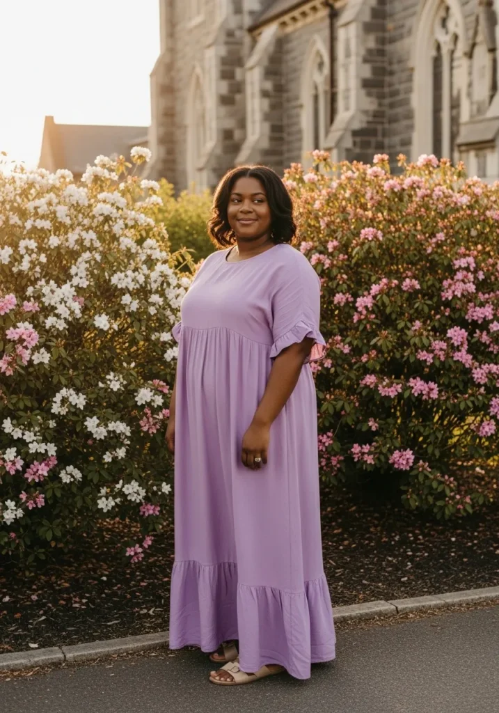 Lavender is one of those colors that always feels calm and feminine to me. I love how this dress looks elegant without needing extra layers or accessories. The flowing fabric makes the whole outfit feel graceful and peaceful which is exactly the mood I love for Sunday mornings.