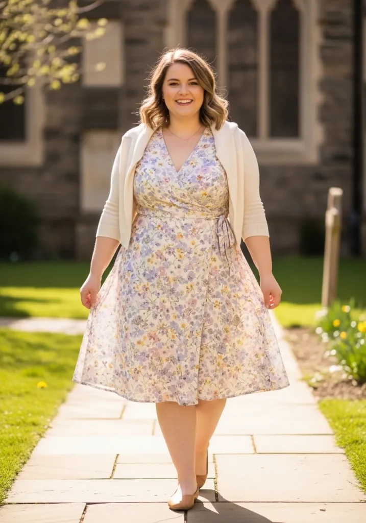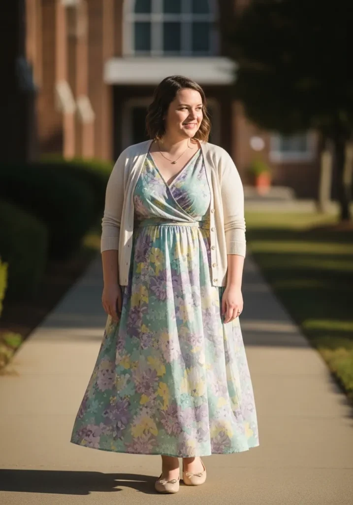 This outfit shows a light floral midi dress with a delicate pattern in soft spring colors. The dress has a gently flared skirt and a modest neckline which makes it perfect for church. A cream cardigan adds a cozy layer while neutral flats keep the look comfortable and classic along the sunny church walkway.