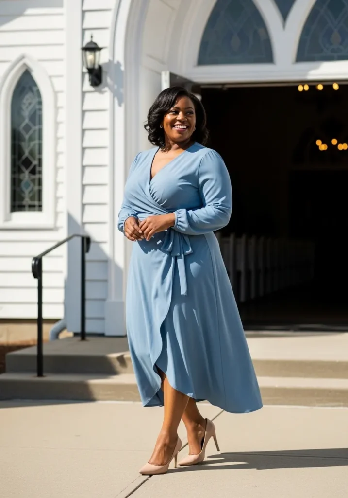 This outfit features a dusty blue wrap style midi dress with long sleeves and a graceful flowing skirt. The wrap design creates a soft waist shape and the fabric drapes beautifully while walking down the church steps. Neutral heels complete the outfit and the light blue tone feels calm and refined in the church setting.