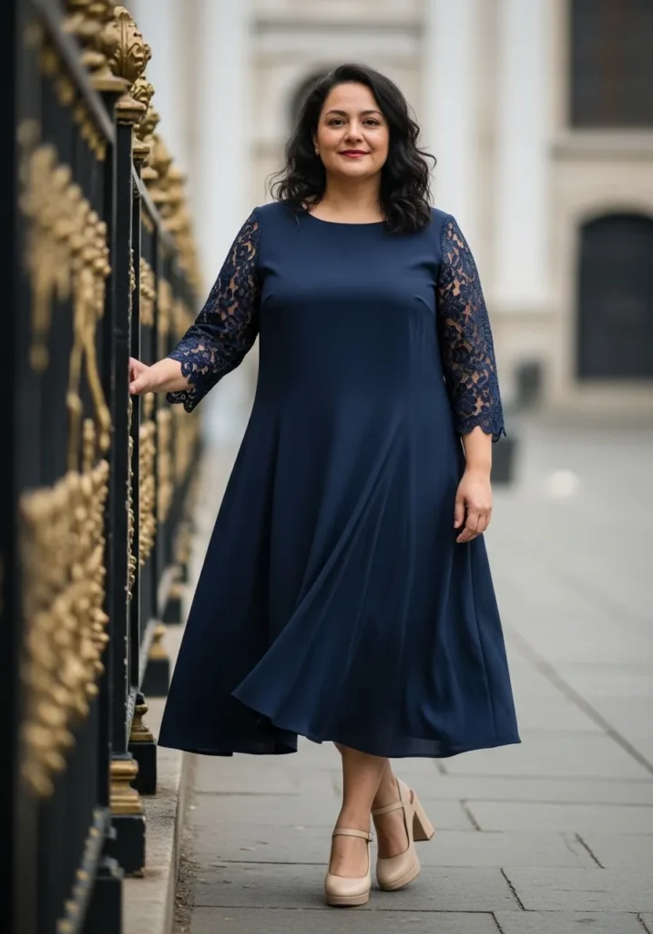 This outfit features a deep navy midi dress with elegant lace sleeves that add beautiful texture and subtle detail. The dress flows softly from the waist and creates a graceful silhouette that feels refined yet comfortable. Nude heels complement the rich navy tone and keep the overall look polished. The classic design paired with the church setting gives the outfit a timeless Sunday elegance that feels quietly sophisticated.