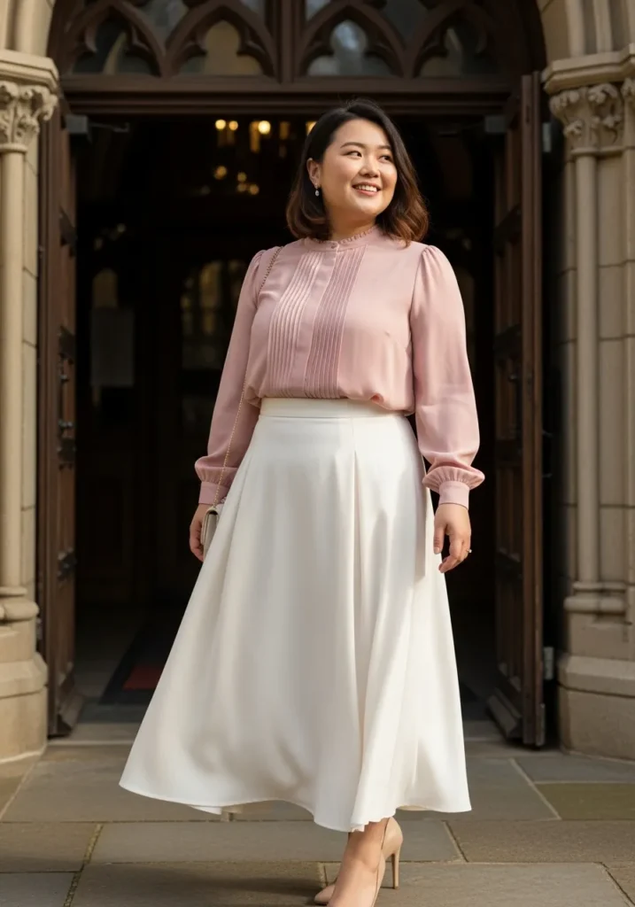 This outfit pairs a delicate blush pink blouse with a flowing ivory midi skirt that moves beautifully with every step. The blouse has a soft airy look while the skirt drapes smoothly and creates a very graceful silhouette. Neutral heels keep the palette light and balanced while the church doorway behind her adds a lovely classic backdrop.