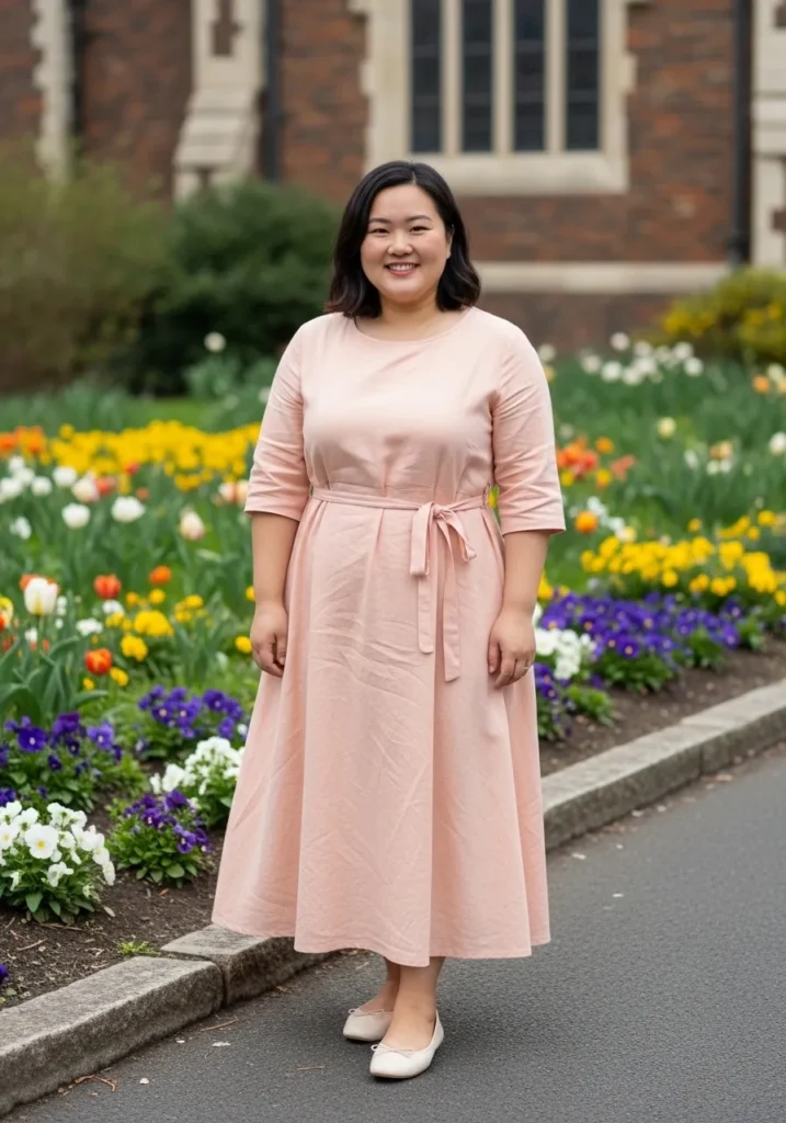 This outfit features a gentle pink midi dress with long sleeves and a matching waist tie that defines the silhouette beautifully. The skirt falls softly below the knees and moves naturally while walking along the garden path. Neutral flats keep the look relaxed and the colorful flowers in the background highlight the soft spring tone of the dress.