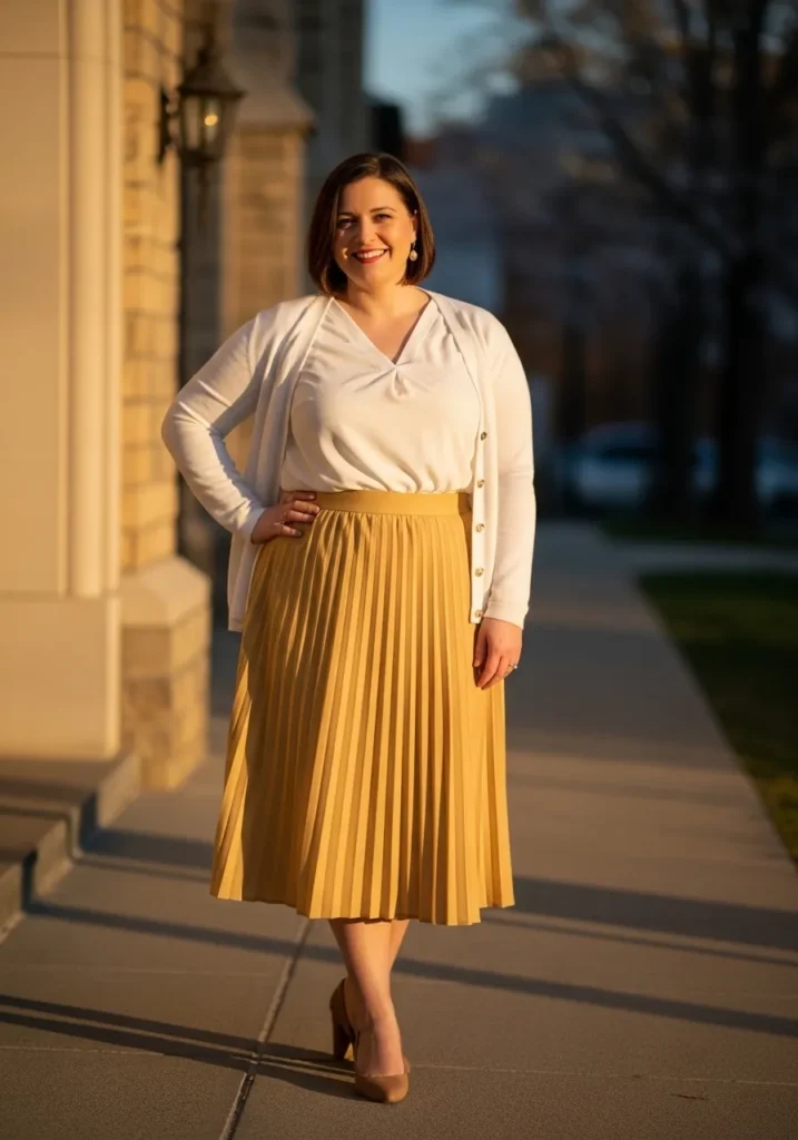 I always feel like pleated skirts instantly make an outfit feel more elegant. The mustard shade is such a lovely choice for spring because it feels bright but still sophisticated. I also love how the cream blouse keeps the look simple and balanced. This combination feels very stylish while still being church appropriate.