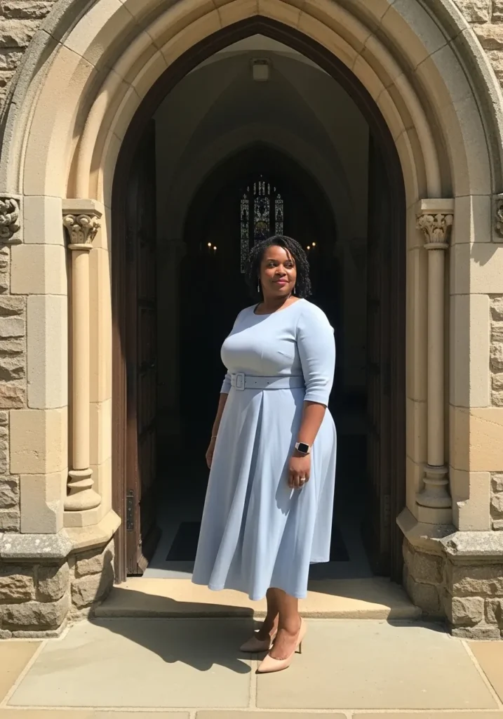 This outfit features a soft powder blue midi dress with long sleeves and a modest neckline that feels perfectly suited for church. The fabric drapes gently and creates a very smooth silhouette that looks elegant and calm. Nude heels finish the look while the grand church archway behind her adds a beautiful architectural backdrop.