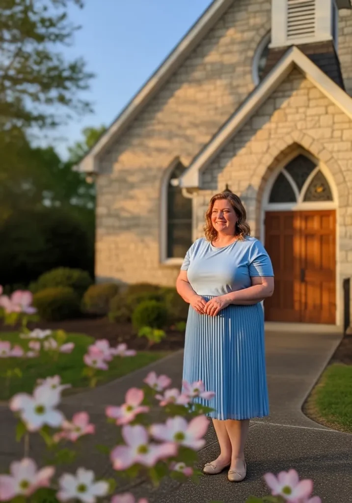 I really appreciate outfits that mix timeless pieces like this. The navy skirt feels polished and a little dressy while the white blouse keeps everything fresh and simple. This combination always reminds me of classic church style that never goes out of fashion. It feels elegant without trying too hard which is exactly what I look for on Sunday mornings.