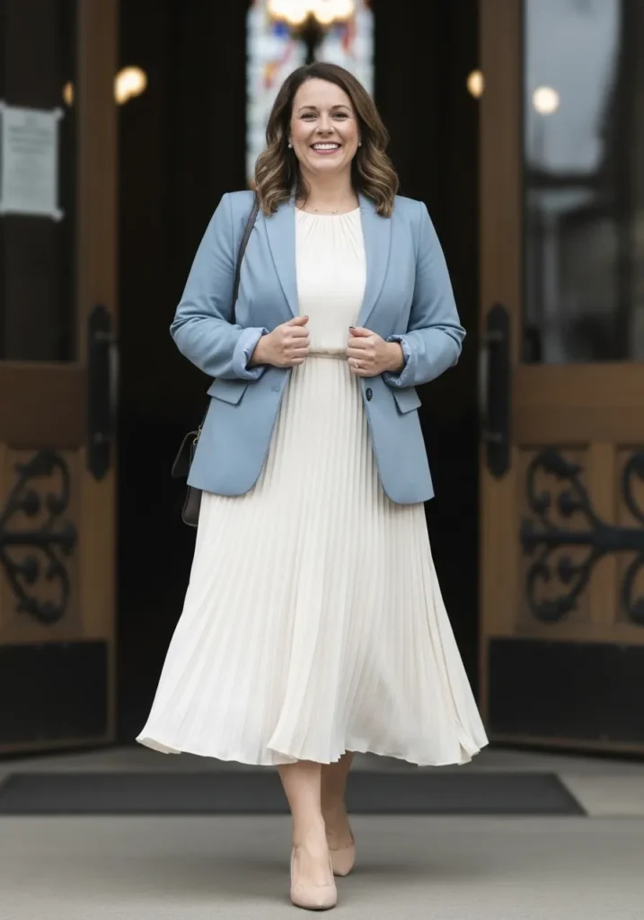 This outfit pairs a soft cream pleated midi dress with a tailored light blue blazer that adds structure and polish. The dress flows gently while the blazer sharpens the silhouette and gives the outfit a refined finish. Nude heels keep the look balanced and the church entrance behind her enhances the elegant feel.