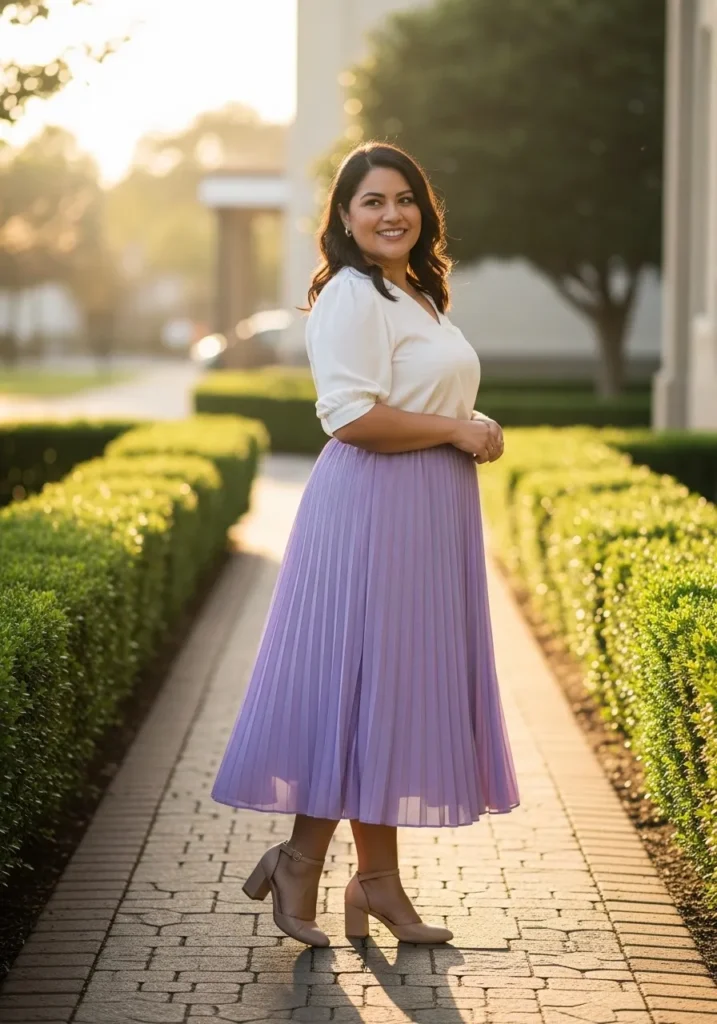 I always think pleated skirts look so elegant for church outfits. The lavender color feels soft and fresh which makes it perfect for spring Sundays. I also love how the white blouse keeps the look balanced and timeless. This is the kind of outfit that makes me feel instantly put together without needing anything complicated.