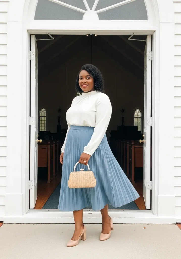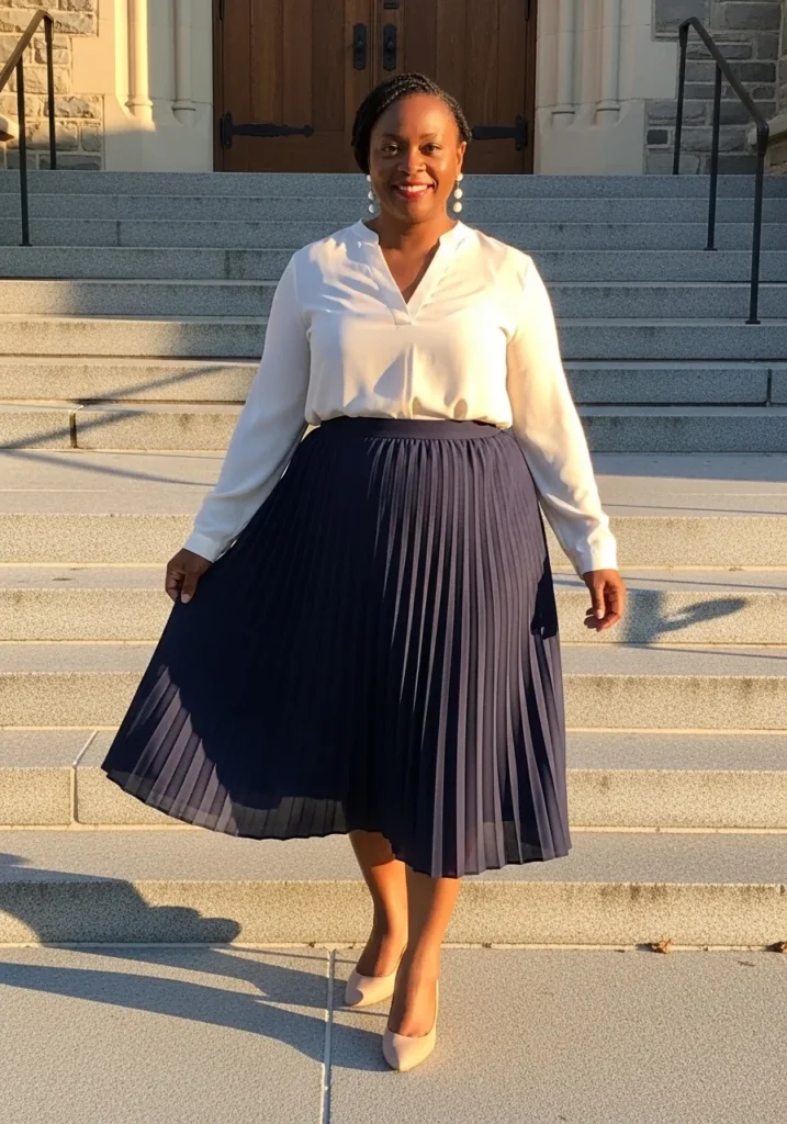 This outfit combines a classic white blouse with a deep navy pleated midi skirt that adds rich contrast and graceful movement. The blouse is tucked neatly which gives the outfit a clean and structured look while the pleats bring softness to the overall style. Neutral heels add height and keep the outfit looking refined while walking down church steps.