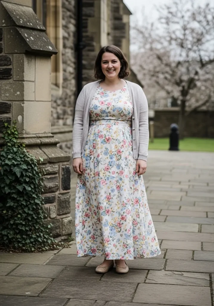 This outfit features a flowing floral maxi dress with soft spring colors scattered across the fabric. The dress falls beautifully to the ankles and the lightweight cardigan adds a modest layer that keeps the outfit church appropriate. Neutral flats complete the look while the stone church walls create a lovely traditional setting.