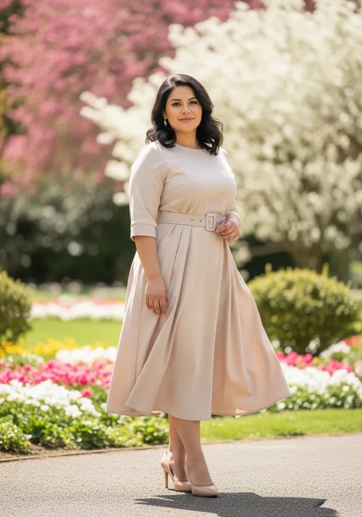 This outfit features a soft blush midi dress with a gently flared skirt that creates a very feminine silhouette. The fitted bodice highlights the waist while the skirt flows outward in a graceful shape. Nude heels keep the look refined and the blooming trees in the background add beautiful spring energy.