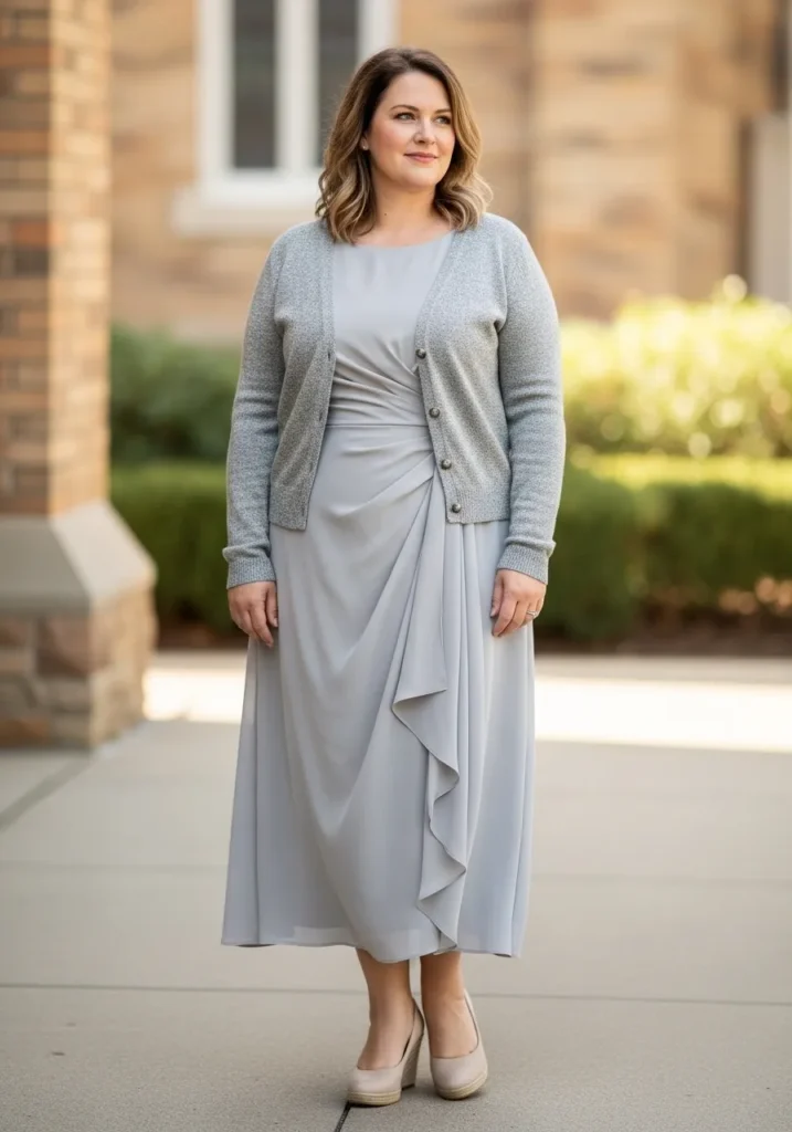 I think gray dresses can be surprisingly elegant when the design has lovely draping like this. The texture makes the outfit feel interesting without needing bright colors. It feels very graceful and mature which I think works wonderfully for church settings. It is understated yet very chic.