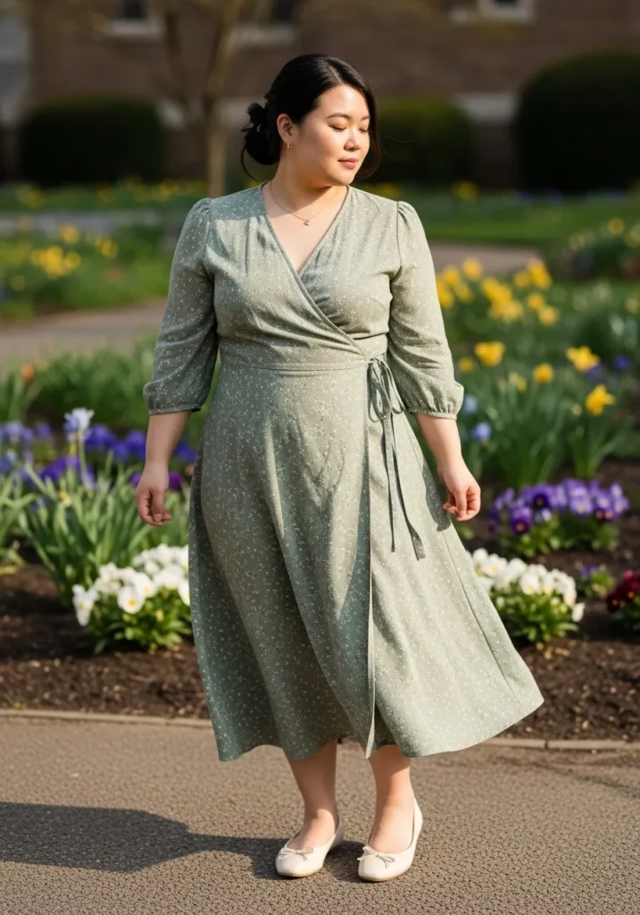 This outfit features a sage green wrap style midi dress with a gentle v neckline and a waist tie that creates a flattering shape. The skirt flows naturally and the soft fabric gives the dress a relaxed movement while walking. Light colored flats keep the look comfortable and simple while the garden setting around the walkway adds to the peaceful spring feel.