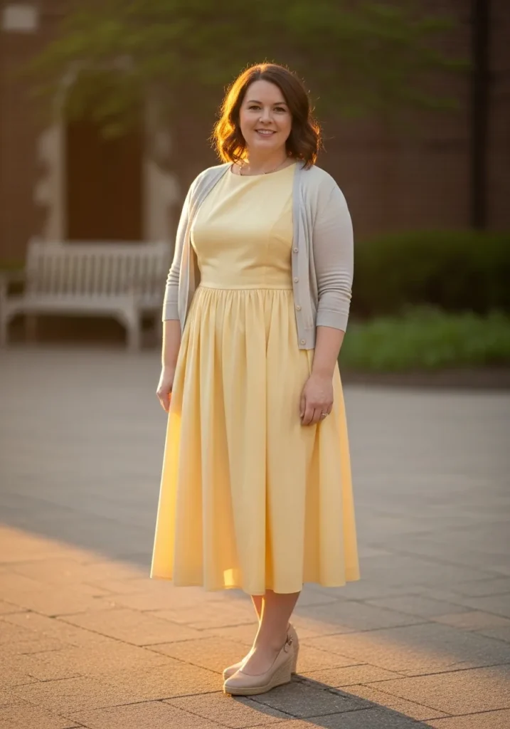 This outfit highlights a soft butter yellow midi dress with a flowing skirt that moves gently while walking. The dress has a modest neckline and a fitted waist that creates a flattering shape. A light cream cardigan adds warmth and balance while neutral flats keep the outfit comfortable and easy to wear. The warm golden light around the church area makes the soft yellow shade glow beautifully.