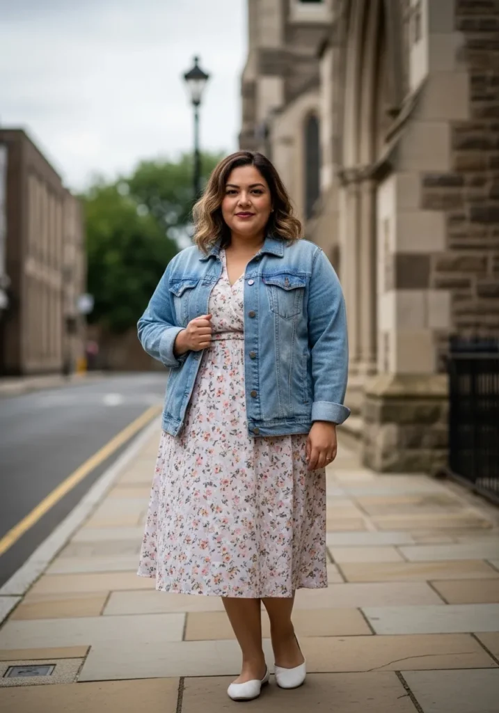 I really enjoy mixing feminine dresses with denim jackets. The combination feels modern and relaxed while still looking appropriate for church. The floral print adds that classic spring vibe that always makes outfits feel cheerful. For me this look feels stylish but still completely comfortable for a full day out.