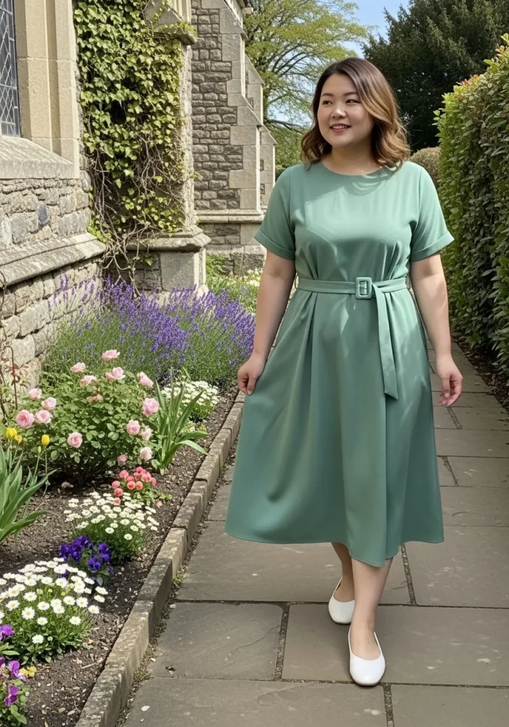 This outfit features a soft green midi dress with short sleeves and a gentle waist belt that defines the silhouette beautifully. The skirt falls in a clean smooth line which gives the dress a graceful and polished look. White flats keep the outfit light and comfortable while the stone church walls and garden flowers create a charming spring setting.