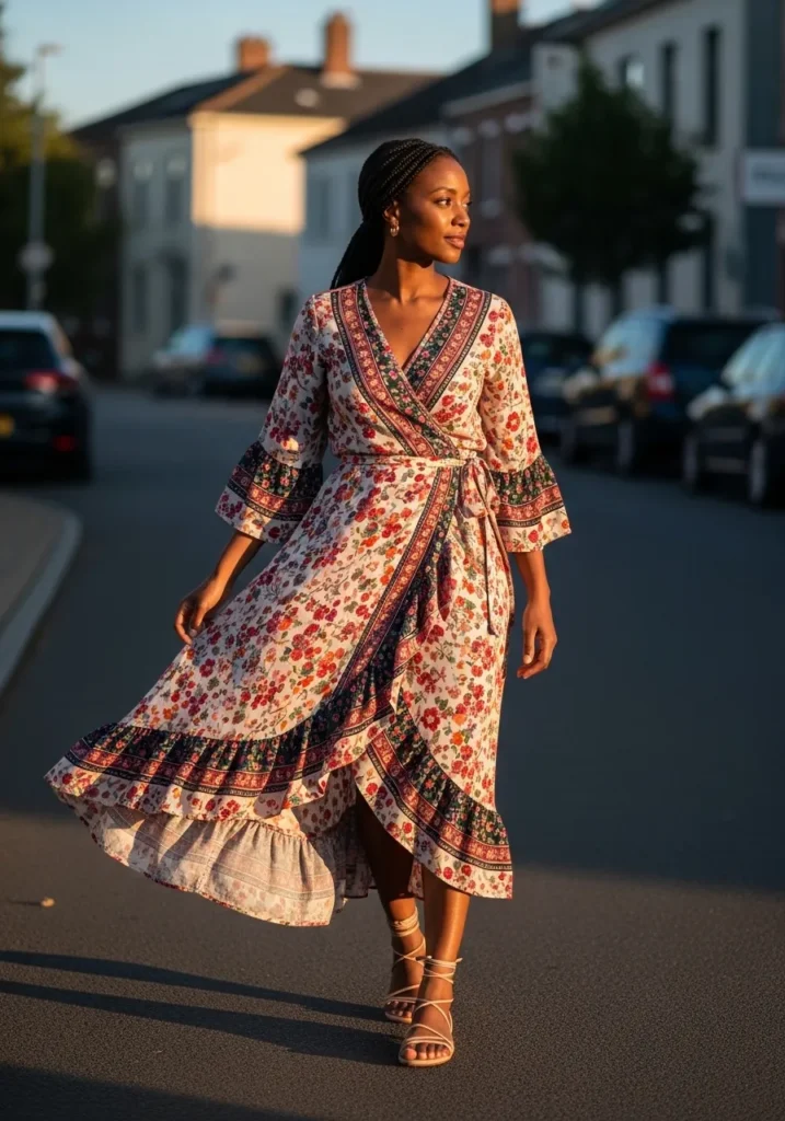 I am drawn to how free and expressive this outfit feels. The wrap cut makes it flattering on so many body types, and the bold print does all the talking so you barely need accessories. It feels like the kind of dress that instantly boosts your mood the moment you put it on.
