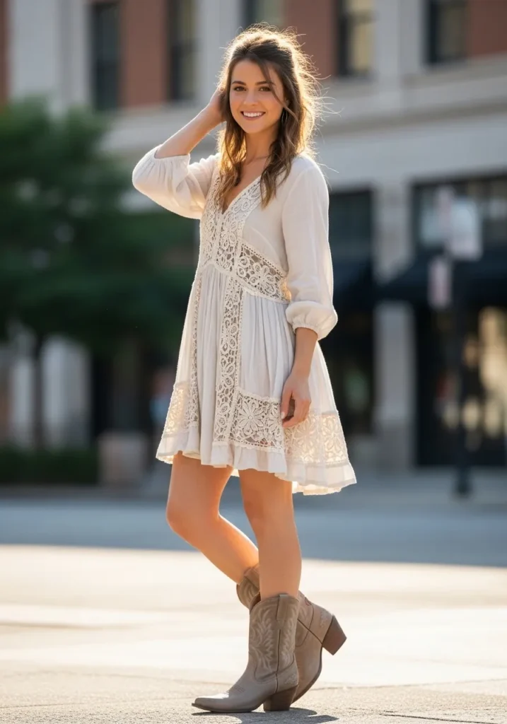 This outfit is all about soft texture and easy charm. The short cream dress features delicate lace accents and a loose fit that feels light and breezy. Paired with western style ankle boots, it leans into that effortless boho spring energy without feeling overdone.