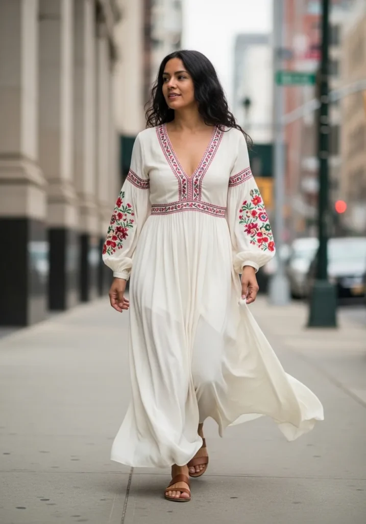 This flowing white maxi dress feels timeless and dreamy. The embroidered details along the neckline and sleeves add subtle color and interest, while the loose silhouette allows the fabric to drape beautifully as you walk. It feels airy, feminine, and perfect for warm spring days.