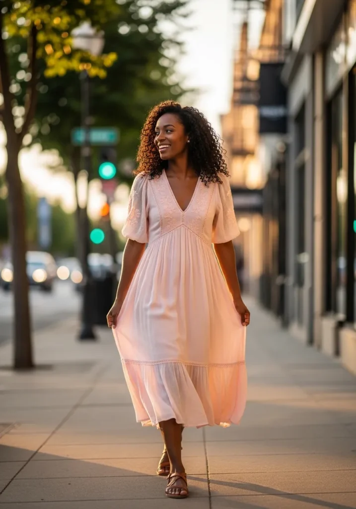 Some people love dresses that feel almost weightless, and this one definitely fits that mood. I like how the gentle color and flowing shape feel flattering without being too dramatic. It gives me that effortless boho energy that works just as well for a park stroll as it does for a casual date.
