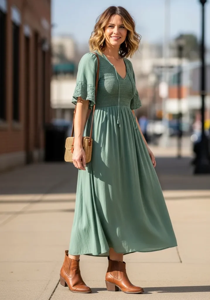 This sage green maxi dress features a softly cinched waist and flowing skirt that creates a lovely shape. The muted green tone feels fresh and natural, while the simple design keeps it versatile and timeless. Styled with ankle boots, it has a grounded boho feel.