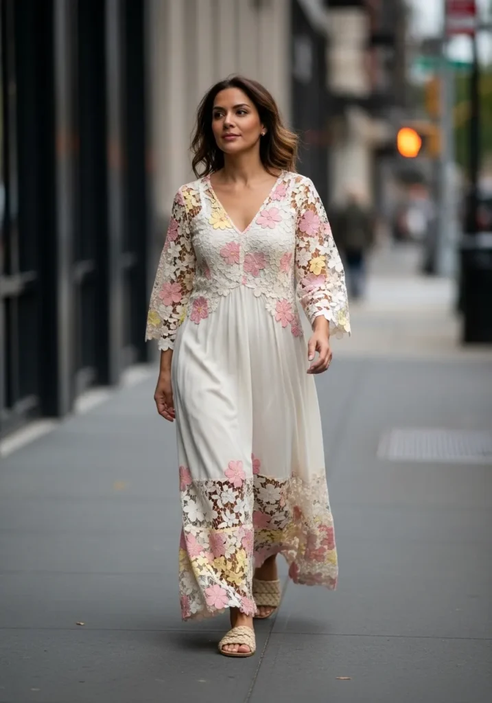 This look features a dreamy ivory midi dress with delicate floral lace layered across the bodice and sleeves, blending soft blush and pastel yellow blooms into the design. The V neckline adds a gentle feminine touch, while the flowy skirt keeps everything light and graceful as it moves. Finished with simple woven sandals, the whole outfit feels romantic without trying too hard.