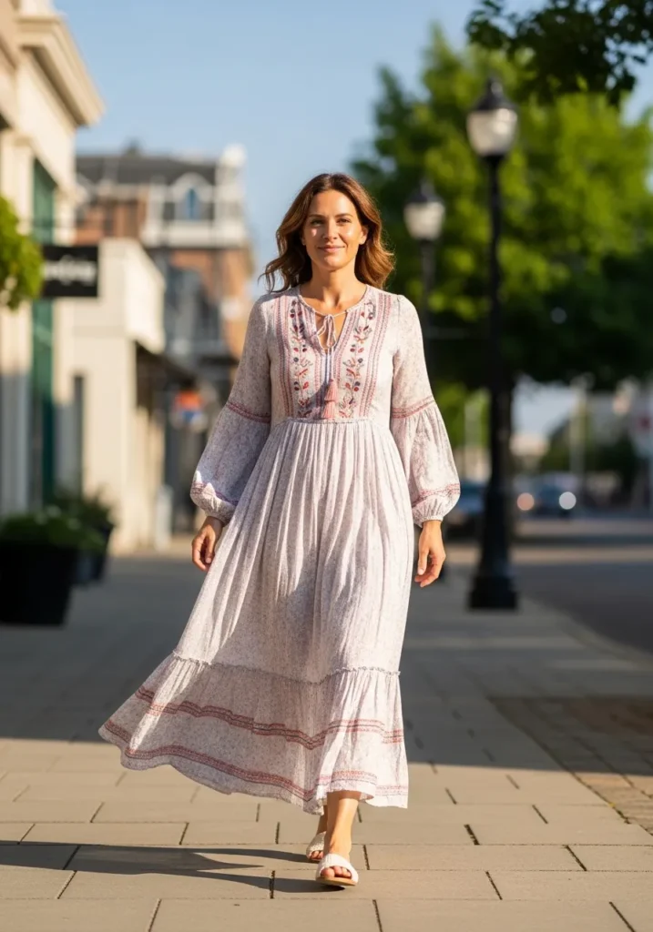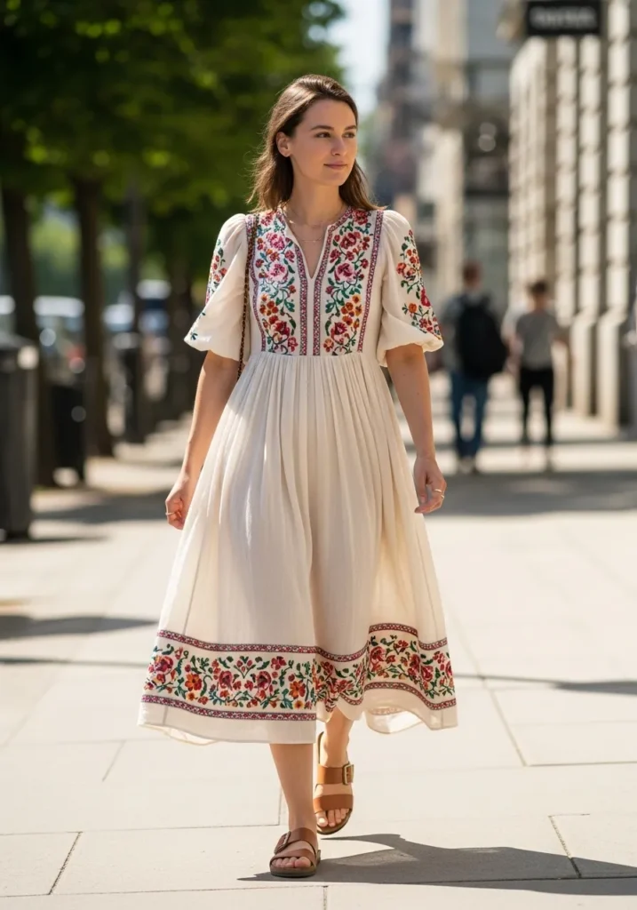 This look features a cream midi dress with colorful folk style embroidery across the bodice and sleeves that instantly gives it a handcrafted boho feel. The flowy skirt moves easily with every step, while the relaxed fit and soft fabric keep it light and breathable for spring. Paired with simple sandals and minimal accessories, the whole outfit feels effortless and artistic without trying too hard.