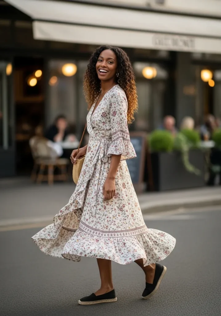 This floral wrap dress features a soft cream base sprinkled with tiny romantic blooms. The wrap silhouette cinches gently at the waist, while the ruffled hem and sleeves add playful movement. Paired with espadrilles and a straw bag, it feels fresh and effortlessly feminine.