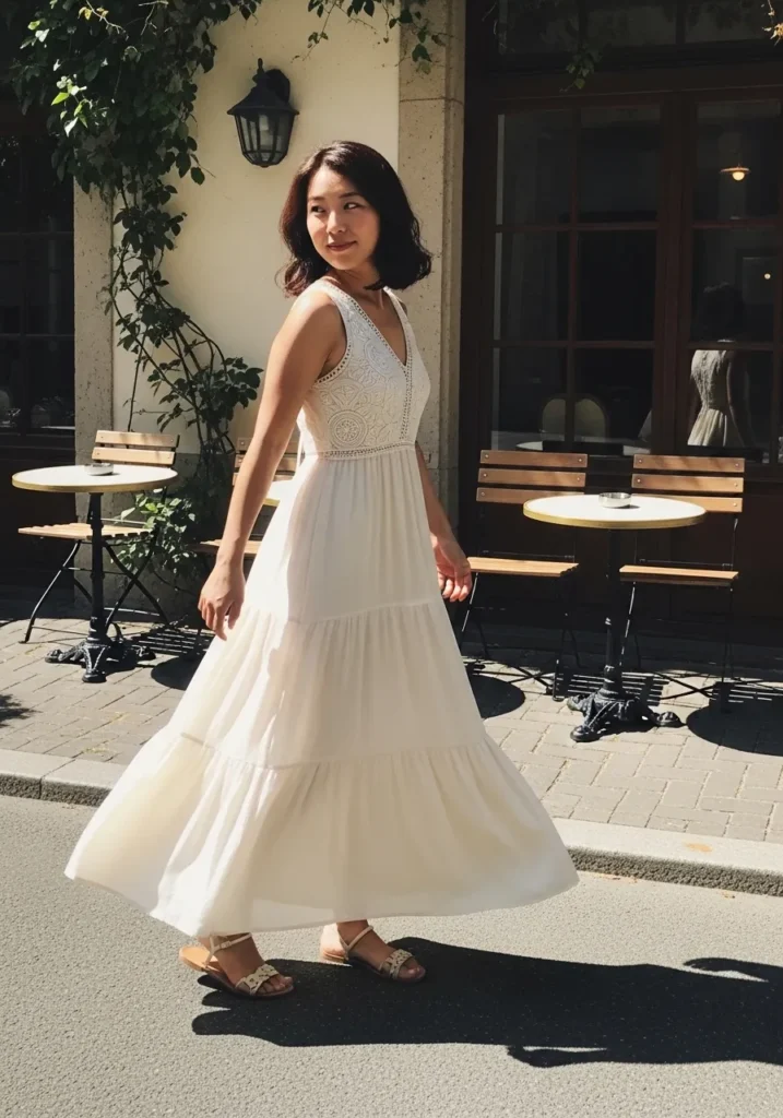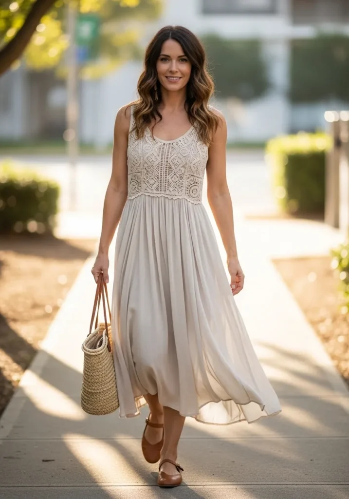 This sleeveless cream maxi dress has a breezy layered skirt that catches the light as you walk. The simple neckline and clean lines let the fabric shine, creating a dreamy and romantic vibe that feels very boho but still modern. Flat sandals complete the look in a relaxed and natural way.