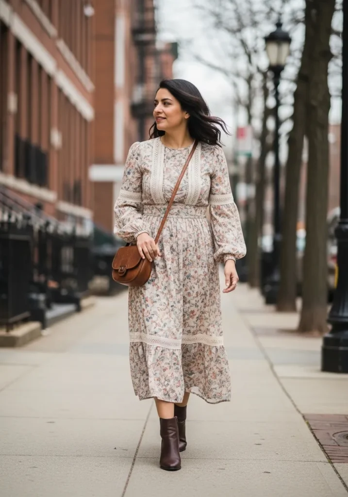 This midi dress showcases a delicate vintage style floral print in soft earthy tones. The long sleeves and modest neckline balance beautifully with the gently flowing skirt. Styled with ankle boots and a small crossbody bag, it feels cozy yet spring appropriate.