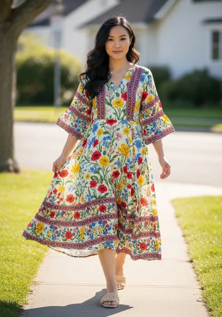 This dress stands out with its vibrant floral print and relaxed silhouette. The wide sleeves and loose fit give it a carefree boho feel, while the bold colors bring instant joy to the look. Paired with simple woven sandals, it feels playful and fresh.