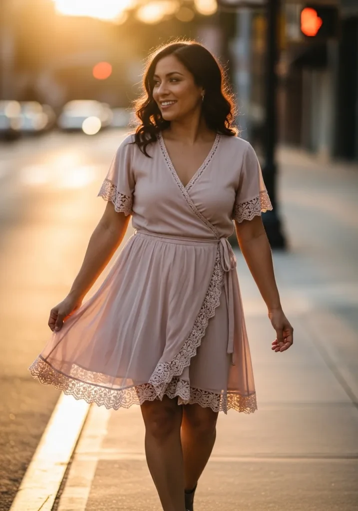 This dusty blush wrap dress is all about gentle movement and feminine charm. The lightweight fabric drapes beautifully, while the subtle ruffle trim adds just the right amount of romance. Short flutter sleeves and a softly defined waist keep the silhouette flattering and relaxed.