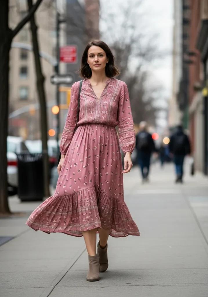 This dusty rose dress features long sleeves and a soft all over print that adds texture without overwhelming the look. The relaxed fit and gently flared skirt give it that classic boho silhouette, while the lightweight fabric keeps it comfortable for everyday wear. Neutral ankle boots add a casual touch that grounds the outfit.