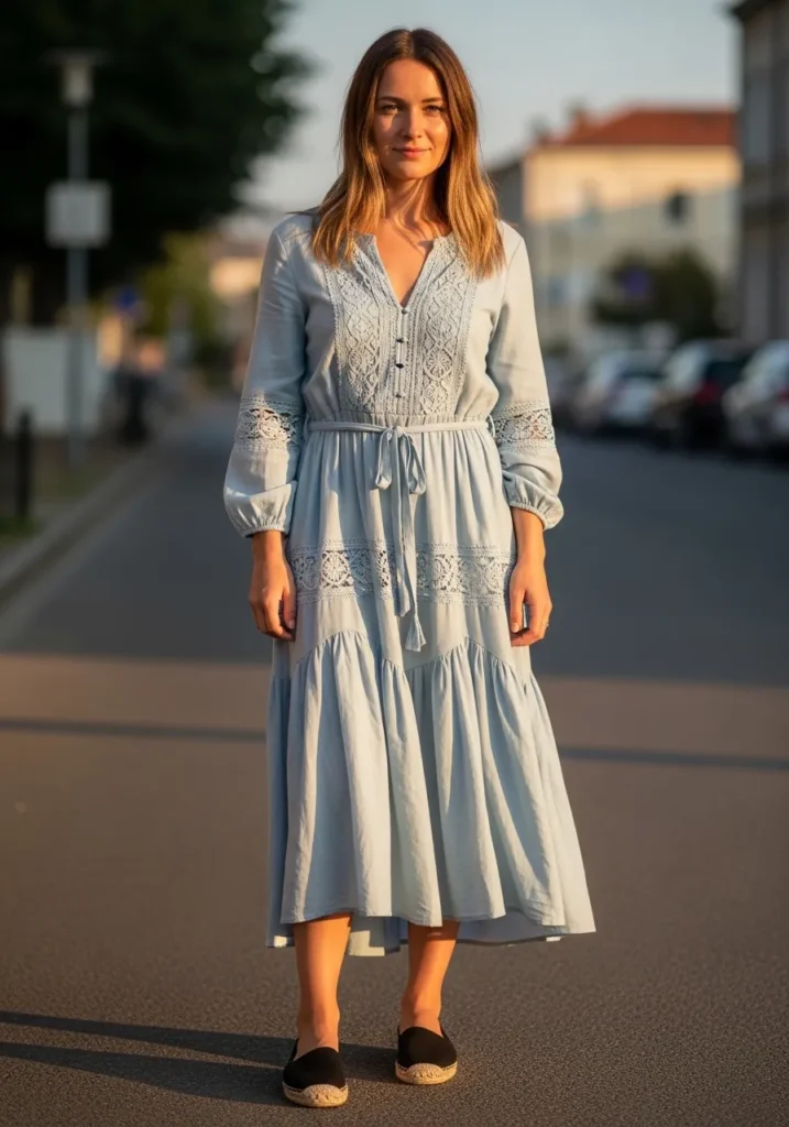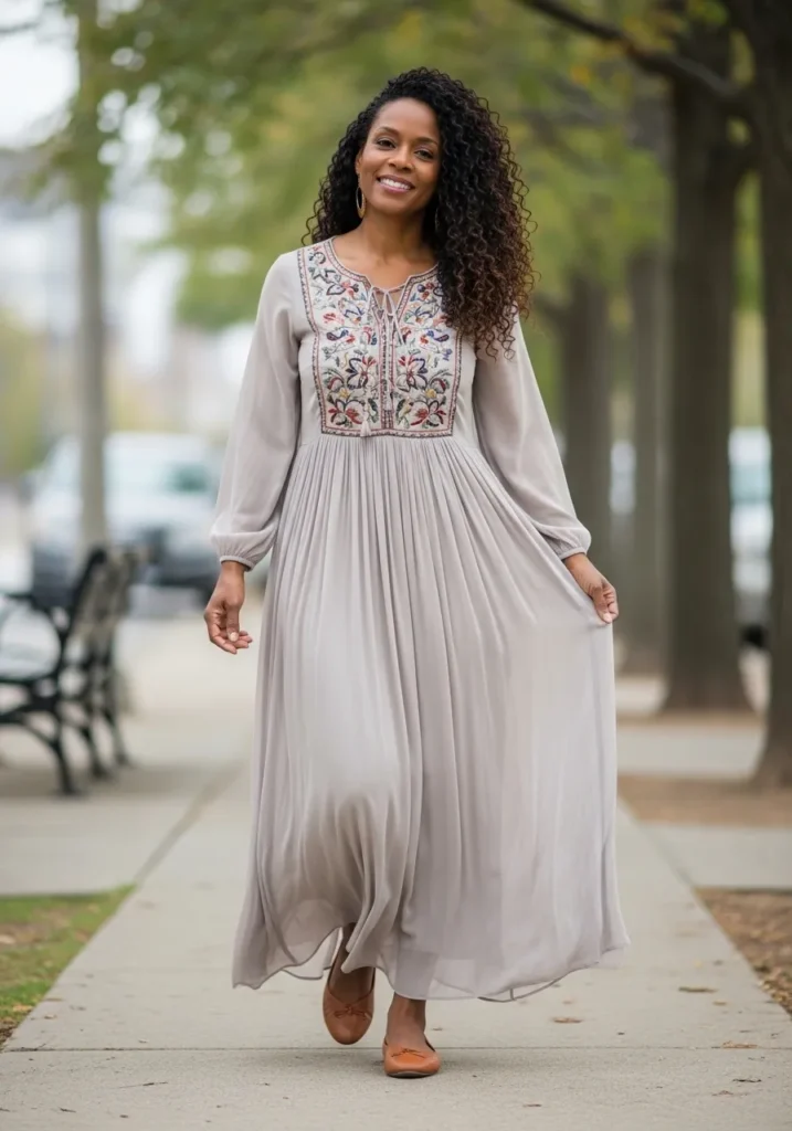 This pale gray maxi dress stands out with its soft pleating and flowing shape. The long sleeves and relaxed waist create an elegant boho feel, while the lightweight fabric keeps everything airy and comfortable. Simple flats keep the look understated and natural.