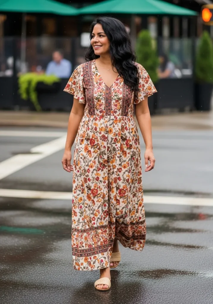 This floral maxi dress features warm earthy tones and a relaxed silhouette that feels effortlessly boho. The short sleeves and flowing skirt make it ideal for spring, while the print adds a slightly vintage touch. Flat sandals keep the outfit grounded and comfortable.