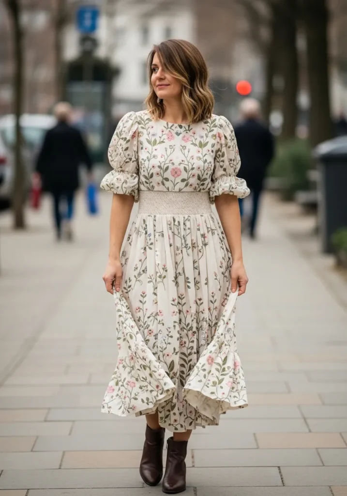 This look features a light cream midi dress covered in delicate floral prints that feel fresh and romantic. The puff sleeves add a gentle vintage touch, while the fitted waist and flowy skirt create that easy boho movement I always love in spring. Paired with ankle boots, the whole outfit feels relaxed yet styled enough for a city stroll.