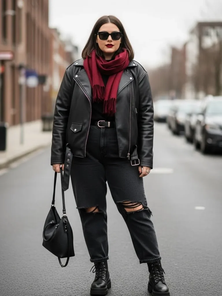 This outfit mixes classic toughness with a bold winter twist through a sleek black moto jacket paired with distressed black jeans that add just the right amount of attitude. A soft burgundy scarf brings a rich pop of color that instantly warms up the look while still keeping the mood edgy. Chunky lace up boots and a structured black handbag keep everything grounded in that cool streetwear vibe. The black top and matching belt tie the entire outfit together and create a clean silhouette that feels strong and confident.