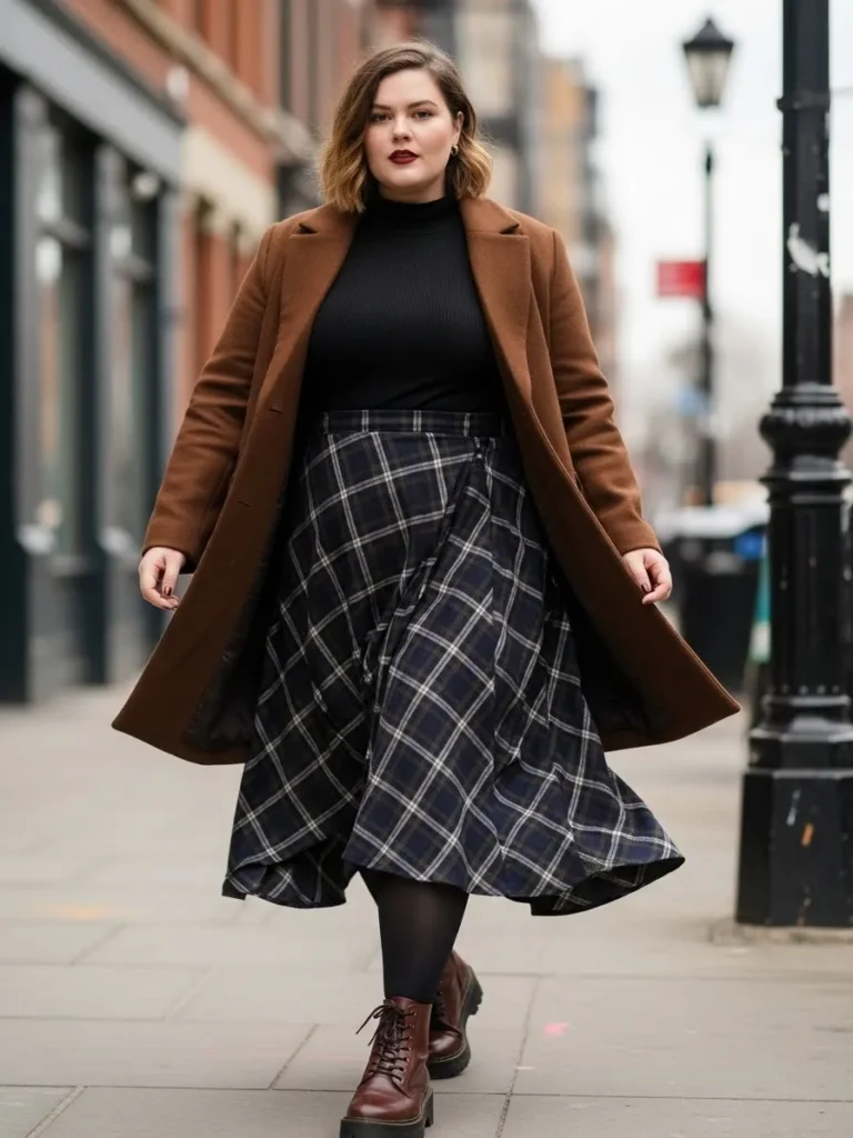 I love how this outfit lets the skirt do all the talking while still keeping the silhouette clean. The contrast between the fitted turtleneck and the flowy plaid skirt feels so flattering and gives that waist defining moment I always look for. The camel coat softens the darker tones and makes everything look chic without trying too hard. Plus I swear a good pair of lace up boots makes me feel like I can handle any icy sidewalk with grace.