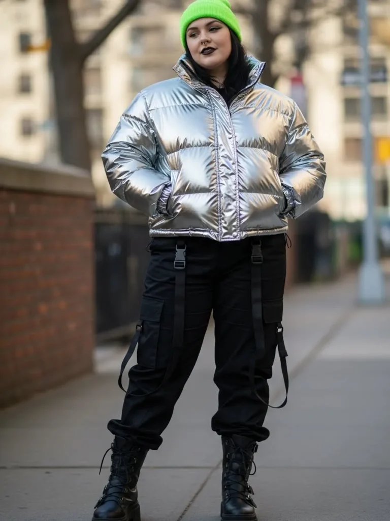 This outfit brings full-on alt winter attitude with a glossy silver puffer jacket that instantly catches the light and makes you look like you walked out of a futuristic streetwear photoshoot. The jacket’s huge padded panels give that warm marshmallow vibe while still looking super edgy. It’s paired with black cargo pants covered in straps and pockets that add just the right amount of grunge utility. Chunky lace up combat boots ground the whole look with tough girl confidence. The bright neon green beanie is the unexpected pop of color that makes the entire outfit feel playful, bold, and impossible to miss. The overall vibe is warm, street smart, and unapologetically alt.