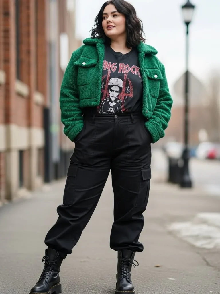 This outfit brings together a bold graphic tee with a cropped green textured jacket that instantly adds warmth and personality. The bright green feels playful against the black base while still keeping that strong alt vibe. The high waisted black cargo pants give the look structure and attitude, and the lace up combat boots finish everything with a tougher edge. The textures mix so nicely too, from the soft teddy fabric on top to the crisp utility feel of the cargos, making the whole look feel cool and ready for winter streets.
